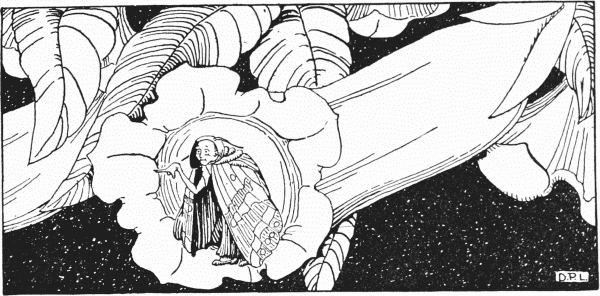 By-and-by, feeling very tired, he sat down to rest, and just where he sat grew a plant with long white flowers like tall thin goblets in shape. Sitting on the grass he could see right into one of the flower-tubes, and presently he noticed a little, old, grey, shrivelled woman in it, very, very small, for she was not longer than the nail of his little finger. She wore a grey shawl that dragged behind her, and kept getting under her feet and tripping her up. She was most active, whisking about this way and that inside the flower; and at intervals she turned to stare at Martin, who kept getting nearer and nearer to watch her until his face nearly touched the flower; and whenever she looked at him she wore an exceedingly severe expression on her small dried-up countenance. It seemed to Martin that she was very angry with him for some reason. Then she would turn her back on him, and tumble about in the tube of the flower, and gathering up the ends of her shawl in her arms begin dusting with great energy; then hurrying out once more she would shake the dust from her big, funny shawl in his eyes. At last he carefully raised a hand and was just going to take[162] hold of the queer, little, old dame with his forefinger and thumb when up she flew. It was only a small, grey, twilight moth!