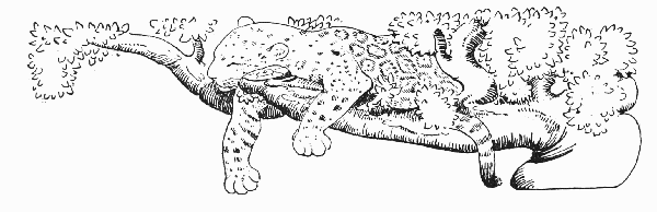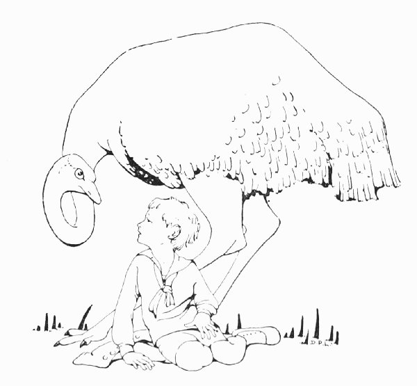 All that day he journeyed on towards the ocean over a great plain. There were no trees and no rocks nor hills, only grass[160] on the level earth, in some places so tall that the spikes, looking like great white ostrich plumes, waved high above his head. But it was easy walking, as the grass grew in tussocks or bunches, and underneath the ground was bare and smooth so that he could walk easily between the bunches.