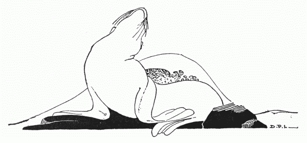 They were sea-lions, a very big sort of seal, but Martin had never heard of such a creature, and being anxious to look more closely at them he went into the gap, and began cautiously climbing down over the broken masses of rock and clay until[167] he got quite near the sea. Lying there on a flat rock he became absorbed in watching these strange dog-headed legless cattle of the sea; for he now had them near, and they could see him, and occasionally one would lift his head and gaze earnestly at him out of large dark eyes that were soft and beautiful like the eyes of the doe that came to him on the hills. O how glad he was to know that the sea, the mighty waters roaring so loud as if in wrath, had its big beasts too for him to love, like the hills and plains with their cattle and deer and horses!