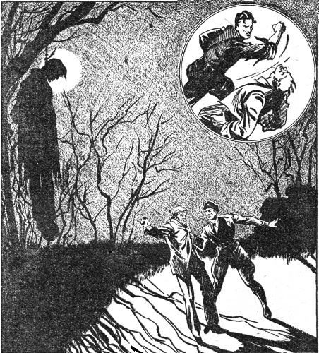 When he picked himself up, he saw something that knocked all ideas of picture taking out of his thick skull. A brilliant blaze of lightning showed him the unmistakable figure of the Black Hood bending over the body of Joseph, the watchman. He saw Black Hood's gauntlet gloved hand closed on the handle of the knife that was thrust into Joseph's neck.