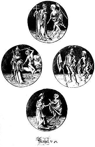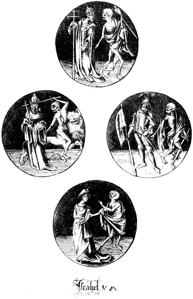 Personification of Death, and other modes of representing it among the Ancients.—Same subject during the Middle Ages.—Erroneous notions respecting Death.—Monumental absurdities.—Allegorical pageant of the Dance of Death represented in early times by living persons in churches and cemeteries.—Some of these dances described.—Not unknown to the Ancients.—Introduction of the infernal, or dance of Macaber.