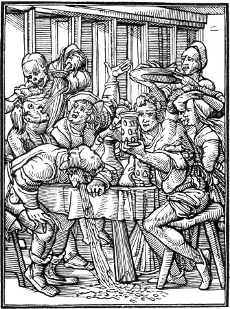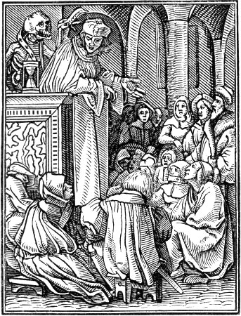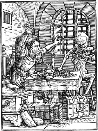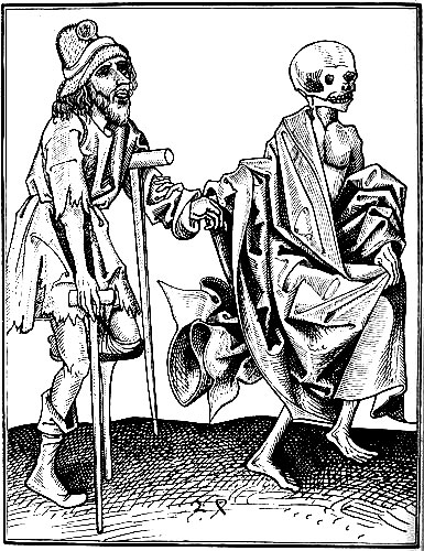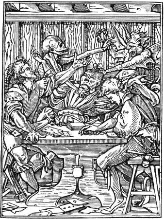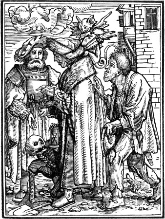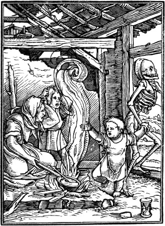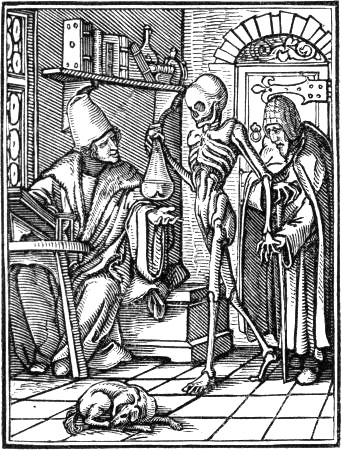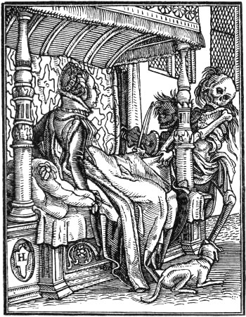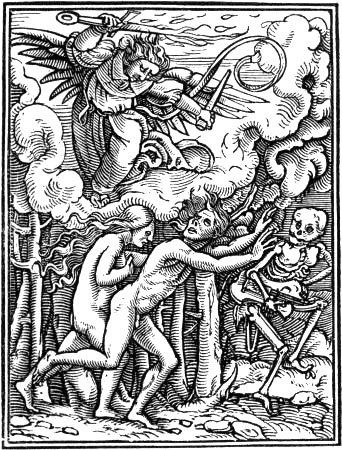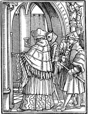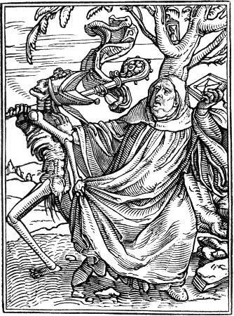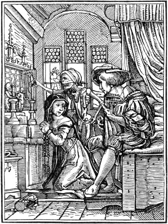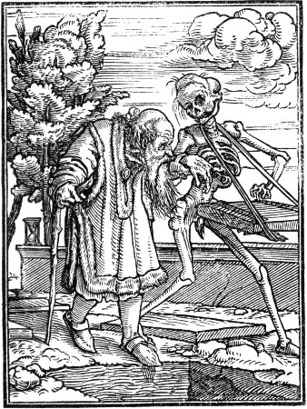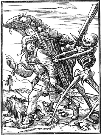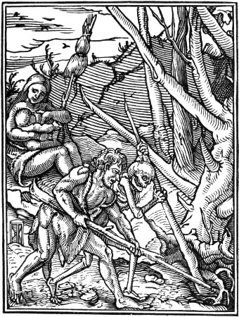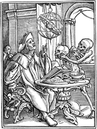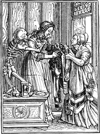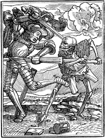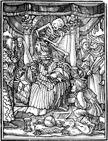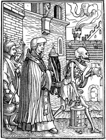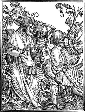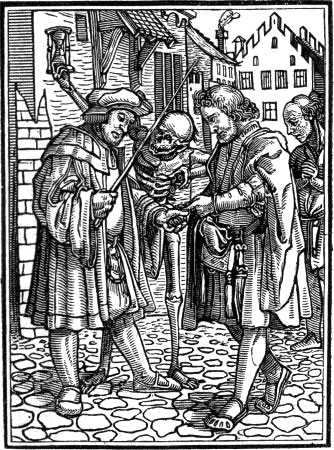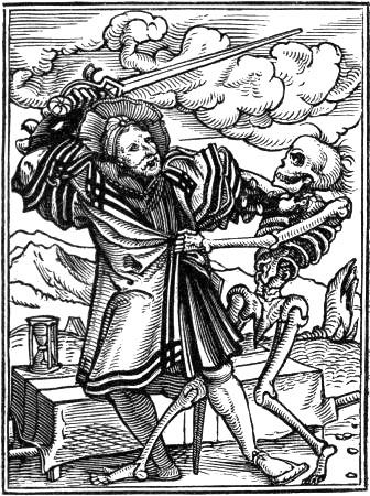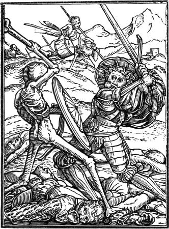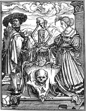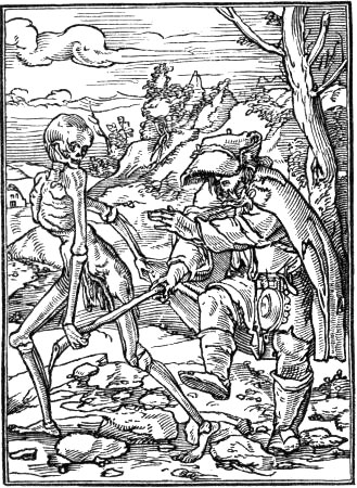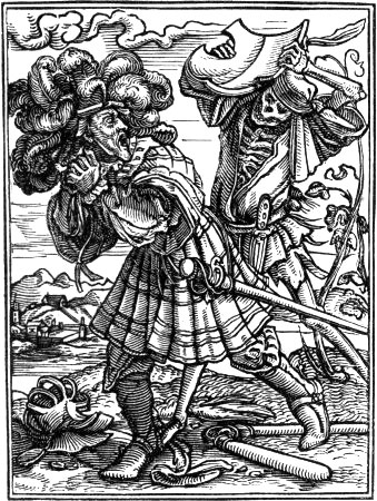 [116] That of 1557 has a frontispiece with Death pointing to his hour-glass when addressing a German soldier.