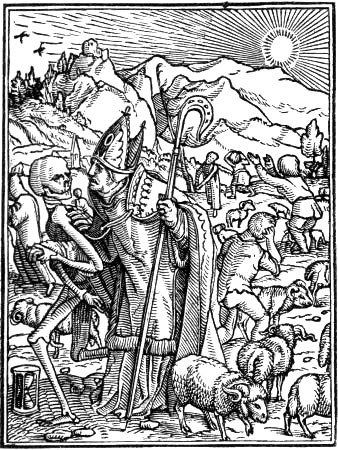 [105] The few engravings by or after Holbein that have his name or its initials are to be found in his early frontispieces or vignettes to books printed at Basle. In 1548, two delicate wood-cuts, with his name, occur in Cranmer’s Catechism. In the title-page to “a lytle treatise after the maner of an Epystle wryten by the famous clerk, Doctor Urbanus Regius, &c.” Printed by Gwalter Lynne, 1548, 24mo, there is a cut in the same style of art of Christ attended by his disciples, and pointing to a fugitive monk, whose sheep are scattered, and some devoured by a wolf. Above and below are the words “John x. Ezech. xxxiiii. Mich. v. I am the good shepehearde. A good shepehearde geveth his lyfe for the shype. The hyred servaunt flyeth, because he is an hered servaunt, and careth not for the shepe.” On the cut at bottom HANS HOLBEIN. There is a fourth cut of this kind in the British Museum collection with Christ brought before Pilate; and perhaps Holbein might have intended a series of small engravings for the New Testament; but all these are in a simple outline and very different from the cuts in the Dance of Death, or Lyons Bible. It might be difficult to refer to any other engravings belonging to Holbein after the above year.