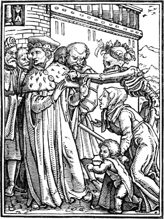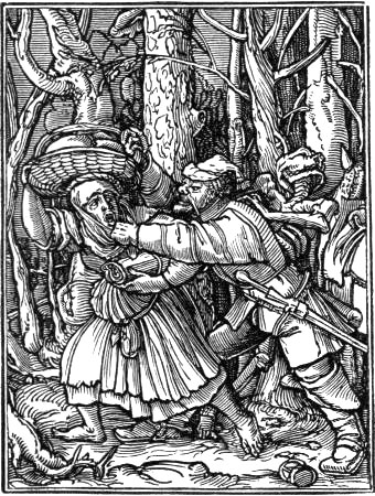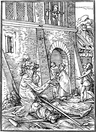 [101] The dedicator has apparently in this place been guilty of a strange misconception. The Death is not sucking the wine from the cask, but in the act of untwisting the fastening to one of the hoops. Nor is the carman crushed beneath the wheels: on the contrary, he is represented as standing upright and wringing his hands in despair at what he beholds. It is true that this cut was not then completed, and might have undergone some subsequent alteration. He likewise speaks of the rainbow in the cut of the Last Judgment, as being at that time unfinished, which, however, is introduced in this first edition.