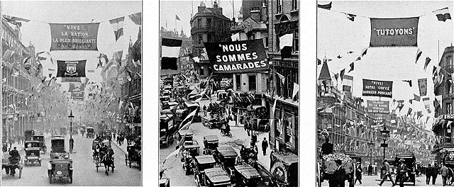 Dans cette atmosphère en demi-teinte flottent, avec une allégresse tempérée, des drapeaux, des flammes autant que Londres, ville correcte et retenue même en ses enthousiasmes, en peut bien arborer: c'est-à-dire que les divers parcours que doivent suivre, en ces trois jours de réjouissances qui commencent, les cortèges officiels sont pavoisés à profusion, bordés de mâts, d'écussons, fleuris de vasques verdoyantes. Des banderoles se tendent dans le ciel calme, dont certaines, à côté des traditionnels souhaits de bienvenue, arborent quelques inscriptions plus libres et d'autant plus touchantes.