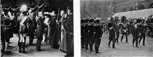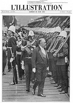L'arrivée au Guildhall: après les présentations, M. Poincaré, accompagné par le duc de Connaught, passe la garde en revue.