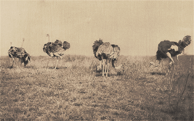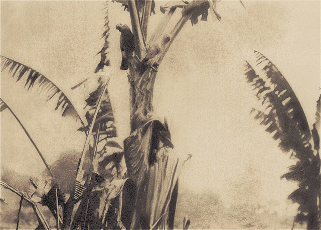 Un jour, une bande de femelles et de jeunes paissait l'herbe nouvelle dans une vallée découverte et je regardais avec intérêt les jeux folâtres des nourrissons qui se poursuivaient, se tiraient mutuellement la queue avec leur trompe, glissaient les quatre fers en l'air dans la boue et se relevaient prudemment en s'aidant les uns les autres. Tout à coup, une saute de vent fit que la troupe me sentit: aussitôt, elle se réunit en un bloc serré, les petits au centre, les nouveau-nés sous le ventre de leurs mères et celles-ci, la tête haute, dodelinant de droite ou de gauche, roulant des yeux blancs, la trompe alternativement étendue et roulée, les oreilles en bataille, me donnèrent un spectacle superbe et très impressionnant, au sens duquel je ne me mépris pas et auquel je me hâtai de me soustraire, non sans avoir pris un bien mauvais cliché, indigne de L'Illustration.