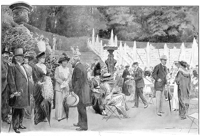 Les réjouissances du Prieuré laisseront, entre toutes les réceptions auxquelles les bâtonniers ont coutume de convier leurs collègues, un souvenir précieux. Sur un petit théâtre de verdure, élégamment aménagé, un spectacle fut donné, qui comprenait des scènes de Samson et Dalila, d'Alceste, de Paillasse, de Carmen, et des danses. Pour un jour, le Palais tout entier s'était transporté dans ce magnifique parc des environs de Paris... Aucun photographe ne s'y trouvait; mais un des hôtes de la fête a bien voulu promener à travers les groupes l'indispensable appareil. Et c'est ainsi que, par une heureuse fortune, nous devons à M. Joseph Lemercier, président de section au tribunal de la Seine, les deux clichés reproduits ici.