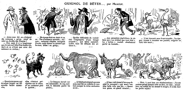 Le théâtre du Grand-Guignol a renouvelé une fois de plus son affiche avant les ardeurs de l'été. Le nouveau spectacle offre cette variété de sujets que comportent les programmes de la maison. L'Affaire Zézette, de MM. Vély et Mirai, histoire d'huissier et de demi-mondaine, est une pièce pour rire, tandis que Dans la Pouchkinskaïa, de M. Gaston-Ch. Richard, est un drame russe à faire pleurer; autant que les acteurs, la poudre y parle. La Buvette, de M. Montrel, est celle de la Chambre des députés; on s'y désaltère avec agrément en revenant des Terres chaudes, de M. Lenormand, où blancs et noir» se comportent selon les lois de l'injustice; dans ce milieu de perversion morale, les bons pâtissent et les méchants triomphent. La Petite Dame en blanc, de M. Paul Giafféri, montre de l'humour, et la Réussite, amusante pièce de M. Max Maurey, représentée naguère, continue à réussir.