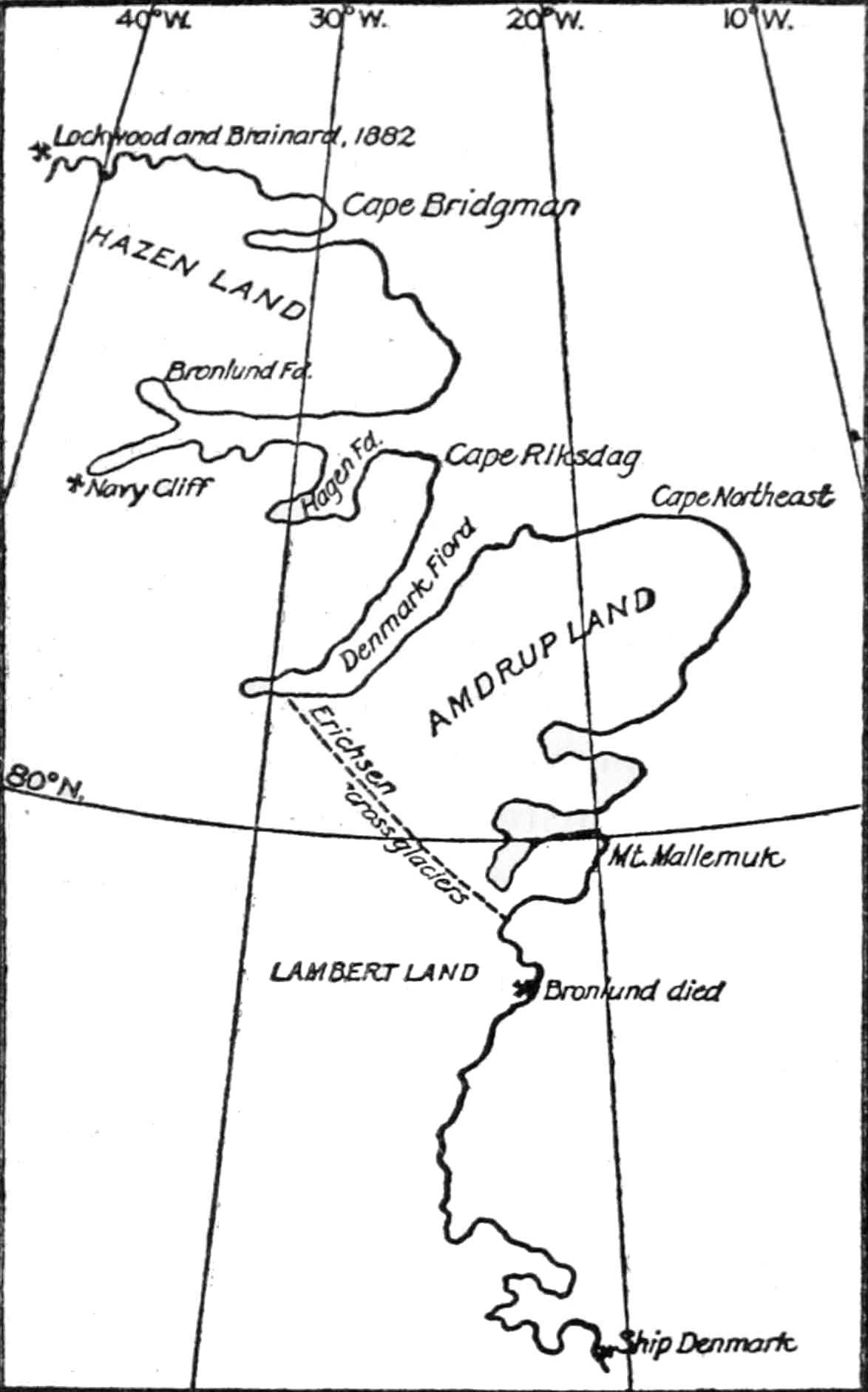 [28] According to the lately published report of the gallant Danish explorer, Mikkelsen, the recovered records of Mylius-Erichsen show that the insularity of Greenland was not discovered by Peary at Navy Cliff. Peary Channel is only a fiord indenting northeastern Greenland, which extends northward as shown in the attached map of Amdrup Land.