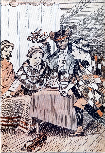 The children stared at him in such surprise that he was compelled to laugh outright. At that, they knew he was only fooling about dinner. Meantime, the ladies began to gather their various wraps and bags and arrange them in order back of the parlor chairs.