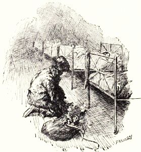 So he arranged the toys quietly under the stockings that hung at the foot of the little white beds, stuffing the stockings themselves with candies and apples and raisins and other delicious things to eat, and then sat down by the fire-place to await the return of Santa Claus and Santa's brother Marmy. As he sat there he looked around the dimly lighted room, and saw the[Pg 21] poor thin white faces of the little sleeping orphans, and his heart stirred with pity for their sad condition. Then he looked at the bag again, and saw the extra dozen toys that were so pleasing to him, and he wondered if it would make the orphans happier next morning if they should wake and find them there, too. At first he wasn't sure but that the orphans had enough; and then he thought of his own hamper full of dolls, and dogs, and tin soldiers, and cars, and blocks, at home, and he tried to imagine how much fun he could get out of a single toy, and he couldn't quite bring himself to believe that he could get much.
