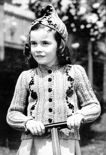 Material—Knitting Worsted, 4 Fold. Coat—10 ounces. Bonnet—3 ounces. 5 yards of Hat Cord. 4 Wooden Buttons.