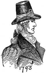 From the year 1750 until after the Revolution there was but little change in the general character of style in men's hats: the custom of erecting the brims by tying or looping them up prevailed. Soon the elevation of the brim of 1750 was abandoned and a change made by looping it at the points of a triangle, producing the three-cornered or "cocked" hat. This was a becoming style we must admit, and one seemingly well suited to the independent, fearless and patriotic characteristics of our forefathers' traits, the possession of which at that time gave us all the comforts that are ours now. The "cocked" hat enjoyed a long popularity, continuing in fashion until near the close of the century, when the "steeple top" and "chimney pot" styles—slang terms for the high beavers—came into vogue, a style which Ashton, an English writer, designates as "the11 hideous head-covering that has martyrized at least three generations."