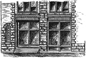 The main entrance to this building is marked by its liberal dimension. A slight elevation is made from the sidewalk, and beyond a recess of several feet are framed two large French plate glass windows, which afford a view of the entire extent of the first floor with its offices and extensive storage room. Entrance doors are placed on either side of this recess.