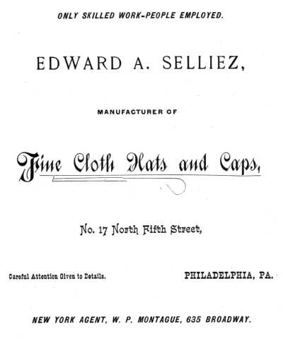 What may have been the actual condition of the hat business of Baltimore just before the Revolution has been difficult to ascertain. Mr. Shields must have been in business during this period, and it is more than probable that in a town of the size of Baltimore at that date there must have been others engaged in this branch of business, but how many and who they were cannot be ascertained. It is very likely that the restriction placed by English rule upon most manufacturing industries prior to the Revolution operated detrimentally upon this industry also, and while the ordinary kind of wool felt hats were made by the hatter in his own shop, undoubtedly most of19 the fashionable hats sold and worn at that time were of English or French make. Paris (which then, as well as now, was the axis upon which revolved the world of fashion) possibly supplied the wants of Baltimore's highborn gentry, always famous for exquisite dress and refined taste, with the French chapeau—the ton of those days.