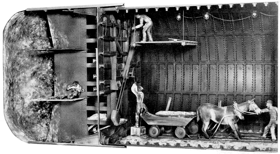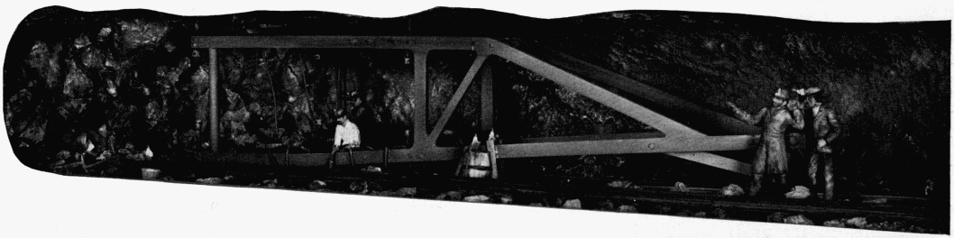 While experimenting, Haupt drove the work onward by the classical methods, shown in the left-hand section of the model (fig. 2). At the far right an advance heading or adit is being formed by pick and hammer work; this is then deepened into a top heading with enough height to permit hammer drilling, actually the basic tunneling operation. A team is shown “double jacking,” i.e., using two-handed hammers, the steel held by a third man. This was the most efficient of the several hand-drilling methods. The top-heading plan was followed so that the bulk of the rock could be removed in the form of a bottom bench, and the majority of drilling would be downward, obviously the most effective direction. Blasting was with black powder and its commercial variants. Some liberty was taken in depicting these steps so that both operations might be shown within the scope of the model: in practice [210] the heading was kept between 400 and 600 feet in advance of the bench so that heading blasts would not interfere with the bench work. The bench carriage simply facilitated handling of the blasted rock. It was rolled back during blasts.