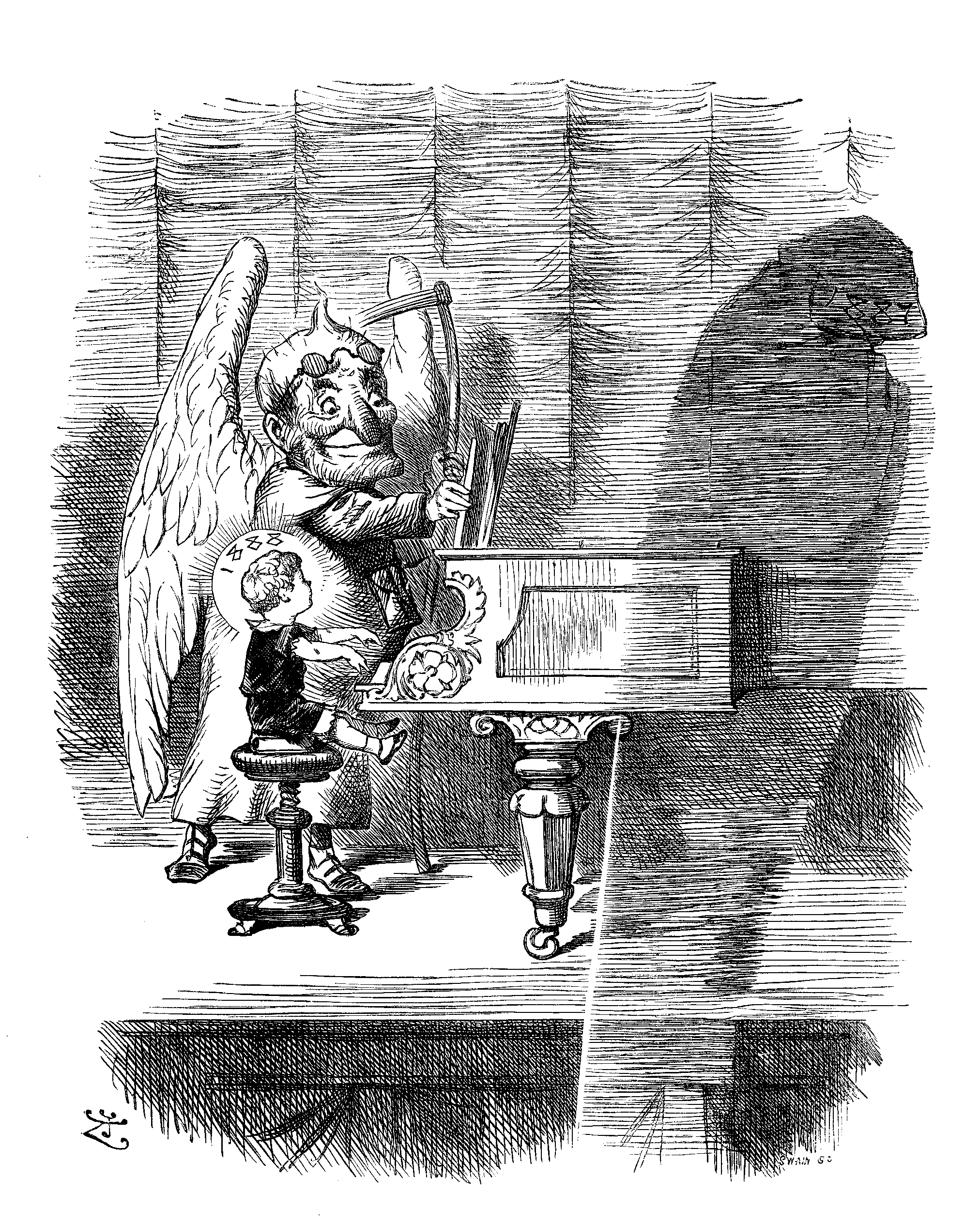 This, Sir, is only a solitary instance of your prescience cited in accidentally turning over the collected pages that seem so familiar and are still so fresh. I could quote indefinitely as I turn over the leaves. But time is shorter than usual this evening. There is less than an hour left of 1877. The procession I spoke of just now has passed out and closed the doors. Under brighter and more inspiriting auspices comes another group. May I present them to my honoured Master? Eighteen Eighty-Eight this is Mr. Punch of whom you may have heard. Mr. Punch, this is Eighteen Eigthy-Eight of whom I expect you will hear a good deal. And here, happier in his possessions than King Lear, are his four daughters—Spring, Summer, Autumn, and Winter. They come to wish you a Happy New Year in which no one joins so heartily as your humble friend and servitor,