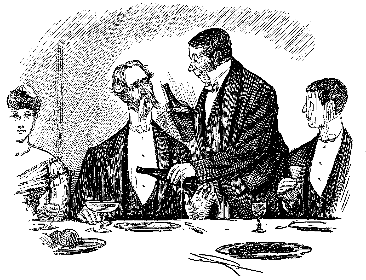 C. I must say I 'ardly expected this—after the leminade. But you're eatin' nothin', young Pianner. (To Servant.) Thank 'ee, my pretty dear, you may leave that raised pie where it is; and do you think you could get us another bottle o' Sham, now—for my young friend here? (To Pianist. You needn't think you've made a conquest with that moony mug of yours. She's only lookin' after you to make me jealous, d'ye see? I know these minxes' ways, bless you.)