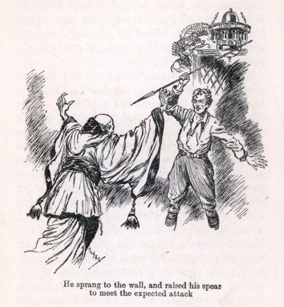 The priests were swarming across the garden, jostling one another in the narrow gate, leaping towards the pagoda. Infuriated at the loss of their colleague, just promoted to the higher rank, and at the trick played upon them, they knew that the "foreign devils" no longer had the Eye at their command, and already gloated over their slaughtered bodies. Venting shrill cries of frenzy, they made straight for the entrance, reckless and without order.