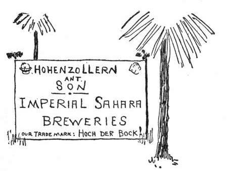 “That partnership has been dissolved, Verbeena lieber. But as soon as Popper schnapps the manacles of Holland off him, a new and splendid project will be put in operation by us ever magnificent and glorious Hohenzollerns. New and great fortunes await us—here on the desert, Verbeenalina! You bet your life on that! What do you think? We intend to establish[Pg 150] a chain of Imperial Breweries on the Sahara where everybody is always so thirsty. Isn’t that great, Verbie? How’s that for high?”