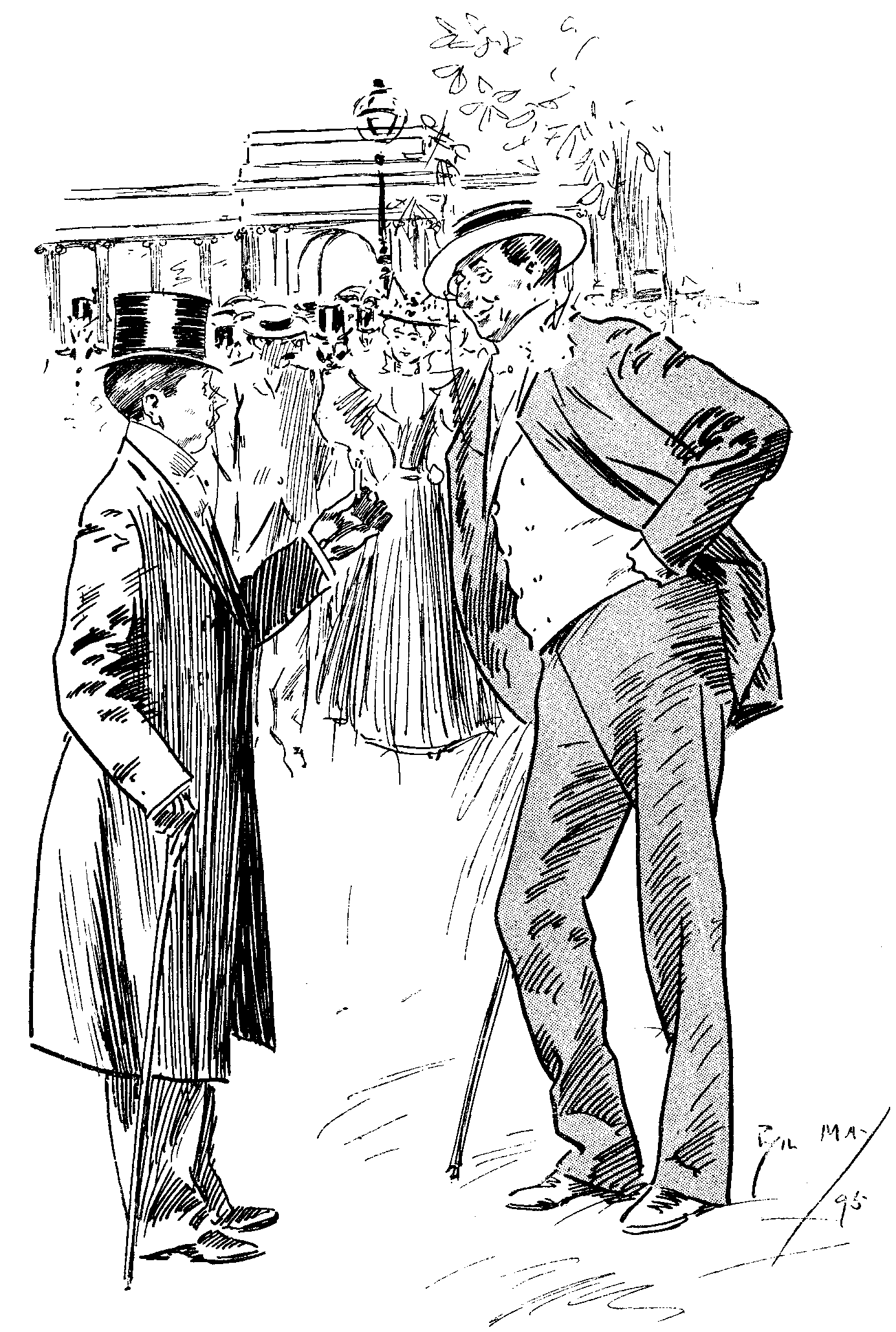 Tuesday.—Prospect of hearing John William move adjournment of House over Derby Day, and John Leng reply on other side, sufficed to crowd benches. Such encounter of wits rarely delights mankind these degenerate days. Such lightness of touch! Such gleaming attack! Such brilliant defence! In short, such badinage! Such persiflage! Old Members recall earlier conflicts in same field. Young Members look back on clever speech made by Elcho in moving adjournment one year, capped by equally brilliant speech when, in the following Session, he seconded Wilfrid Lawson on the negative course. [pg 276] This and all else would be excelled when John William began to jest, and Leng made light reply.