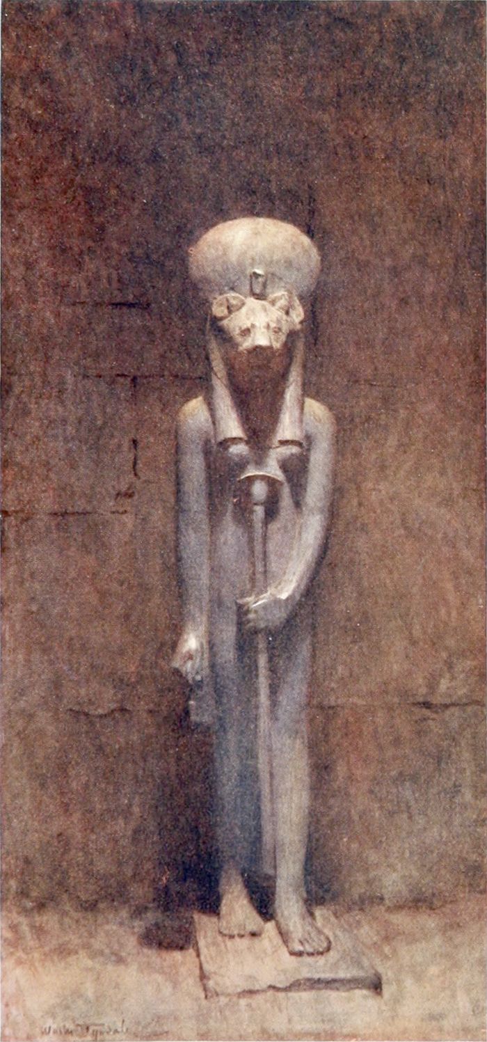 M. Legrain nous conduisit au temple de Ptah; la chaleur intense du jour nous faisait vivement désirer d'y trouver de l'ombre fraîche. Après avoir traversé deux cours, nous pénétrons dans une petite pièce, et y heurtons presque la statue à tête de lionne de la déesse Sekhmet. C'est une splendide créature et nous sommes reconnaissants au sort qui, au lieu de l'adjuger à quelque musée, lui permit de demeurer dans le cadre où la plaça Thothmès. M. Legrain nous raconta qu'il l'avait trouvée quelques années auparavant dans le même endroit, mais brisée en soixante morceaux. Heureusement, aucun ne manquant, il put la 221 reconstituer et on lui permit de la laisser dans le cadre qui lui convient si bien. Cette déesse de la Guerre, à tête de lionne, inspire la frayeur et le respect au prime abord, quand on la voit dans l'ombre de la pièce, toute voilée de mystère.