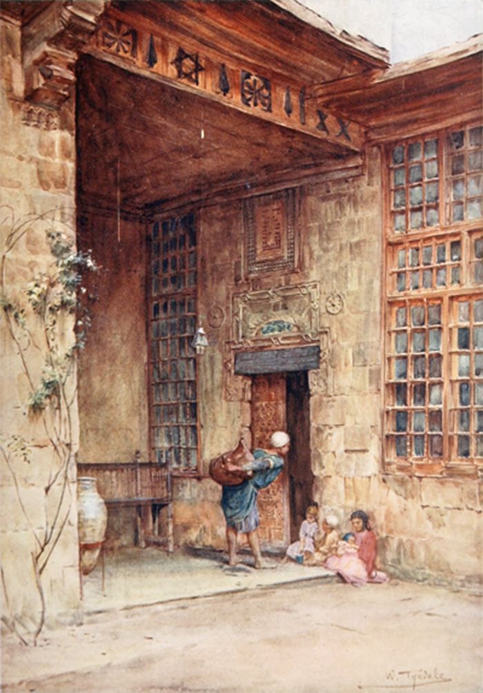 Une petite rue étroite qui longe la Merdani nous conduit dans une artère plus large, dont les maisons évoquent une aristocratie déchue. L'une d'elles, avec un portail majestueux et de grandes bay windows dont les stores de bois sculpté sont brisés et raccommodés çà et là au moyen de morceaux de caisses d'emballage, semblerait indiquer que son propriétaire est complètement ruiné, à moins, au contraire, que ses affaires ne soient si prospères qu'il ait pu se construire une autre habitation dans le nouveau quartier d'Ismalieh en laissant son ancienne demeure à la garde des rats et d'un vieil eunuque. J'ai souvent trouvé dans ces vieilles maisons des cours fort intéressantes, mais il est difficile d'en obtenir une bonne vue. La porte massive est souvent ouverte, mais le passage qui conduit à l'intérieur de la cour fait généralement un brusque coude au bout de quelques mètres, coupant ainsi la perspective.