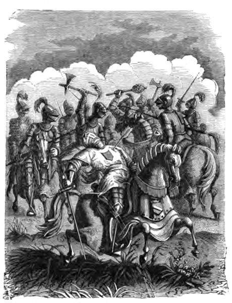 Il portico doppio era un palazzo presentante due ordini d'arcate l'una sull'altra. Giunti dal castello [7] il Marchese, la Marchesa, il loro figlio e numerosa comitiva, salirono sull'arcata superiore, e s'assisero nei proprii seggi, a vista di tutto il popolo. Qual fu la generale maraviglia quando, dopo aver fissato gli occhi sui personaggi seduti, si potè discernere, in un folto gruppo d'uomini e donne del seguito che stavano in piedi l'infelice Berardo, la moglie ed i figli.