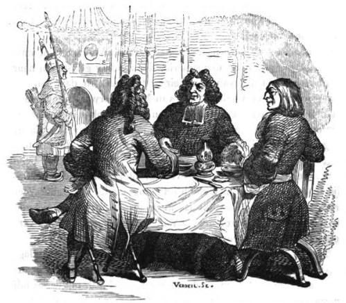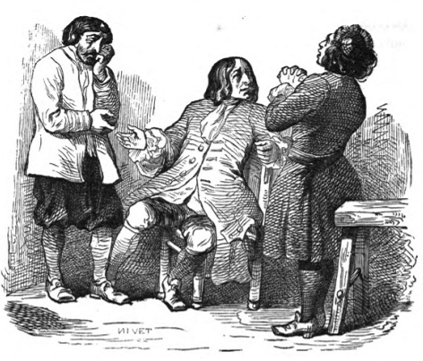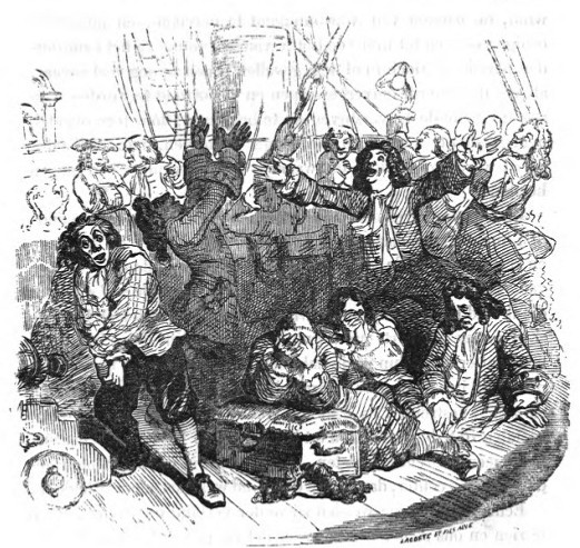 Terwijl zij aldus rustig voortleefden, kwamen de drie schurken, en dat nog wel hunne landslieden waren, bij hen, alleen uit lust om hen te schelden en te beschimpen. Zij zeiden, dat het eiland hun toebehoorde, dat de gouverneur, waarmede zij mij bedoelden, hen in het bezit er van gesteld had, en niemand anders er eenig regt op had, terwijl zij onder afgrijsselijke vloeken betuigden, dat zij op hunnen grond geene huizen zouden bouwen zonder er belasting voor te betalen.