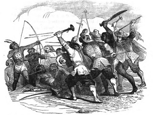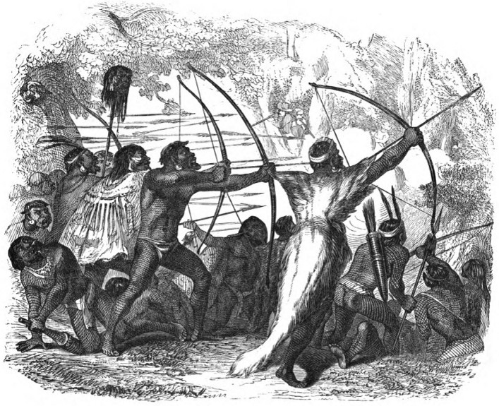 Wel verre van met dit antwoord tevreden te zijn, kwam den volgenden morgen met het krieken van den dag eene groote troep van hen ons kamp opzoeken; maar toen zij ons in zulk eene voordeelige stelling zagen, durfden zij niet verder komen, dan de beek voor ons, waar zij staan bleven, en aan ons eene menigte vertoonden, zoo talrijk, dat wij er inderdaad van ontzetteden; want naar de geringste schatting waren er wel tienduizend. Zij bleven daar eene poos ons staan opnemen, en toen zonden zij, onder een geweldig geschreeuw ons eene wolk van pijlen toe, maar daartegen waren wij zeer goed beschut, want wij zochten eene schuilplaats achter onze pakken, en ik herinner mij niet, dat iemand onzer eene kwetsuur ontving.