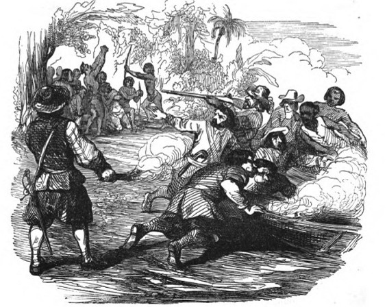 Wij mikten zoo goed, of de hemel bestierde ons vuur zoo, dat wij bij de eerste losbranding er veertien doodden, en nog verscheidenen benevens eenige paarden kwetsten, want wij hadden allen onze geweren met ten minste twee of drie kogels geladen.