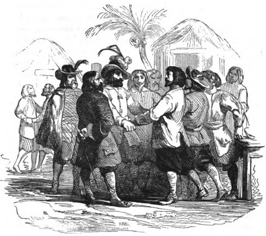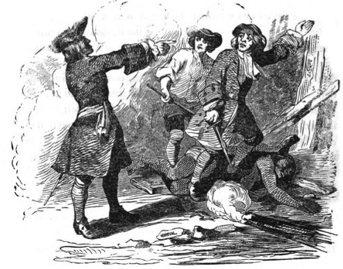 De anderen hadden ook vuurwapens bij zich, maar de moedigste van de twee eerlijke Engelschen (gelijk ik hen voortaan noemen zal) door het gevaar wanhopig gemaakt, zeide, dat zij hen zouden doodschieten als zij hand of voet bewogen, en gelastte hen hunne wapens af te leggen. Dit laatste deden zij wel niet; maar de standvastigheid van de anderen bragt hen tot onderhandelen, en zij verlangden den gekwetste mede te nemen en te vertrekken; het schijnt, dat deze vrij zwaar gekwetst was. Zij hadden echter ongelijk, dat zij, thans de overhand hebbende, hen niet ontwapenden, gelijk zij hadden kunnen doen, en daarop naar de Spanjaards toegingen en hun verhaalden hoe de schurken hem bedreigd hadden, want deze drie zonnen op niets dan op wraak, en gaven toen dagelijks de blijken daarvan.