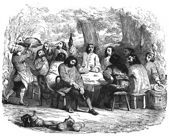 De eenigste pligtmatige daad der schurken was, dat toen de Spanjaarden aan wal stapten, zij hun mijnen brief gaven, en levensmiddelen en goederen, gelijk ik gelast had. Ook gaven zij hun de vele geschrevene aanwijzingen, hoe ik gedurende mijn verblijf aldaar gehandeld had, hoe ik mijn brood bakte, mijne tamme geiten aanfokte, mijn koorn plantte en mijne druiven droogde, potten bakte, kortom, hoe ik alles deed. Dit geheele schriftelijke opstel gaven zij aan de Spanjaarden, waarvan twee vrij goed Engelsch verstonden. Ook weigerden zij in den beginne niet, hen met een en ander te gerijven, want zij leefden eerst in vrij goede verstandhouding; zij vergunden hun mede het gebruik van het huis of den kelder, en zoo leefden zij vrij gezellig, en de Spanjaard, die veel van mij afgezien had, benevens Vrijdags vader, beschikten alle werkzaamheden. De Engelschen deden niets anders dan het eiland rondzwerven, papegaaijen schieten en schildpadden vangen, en als zij des avonds te huis kwamen, hadden de Spanjaarden het eten voor hen gereed gemaakt.