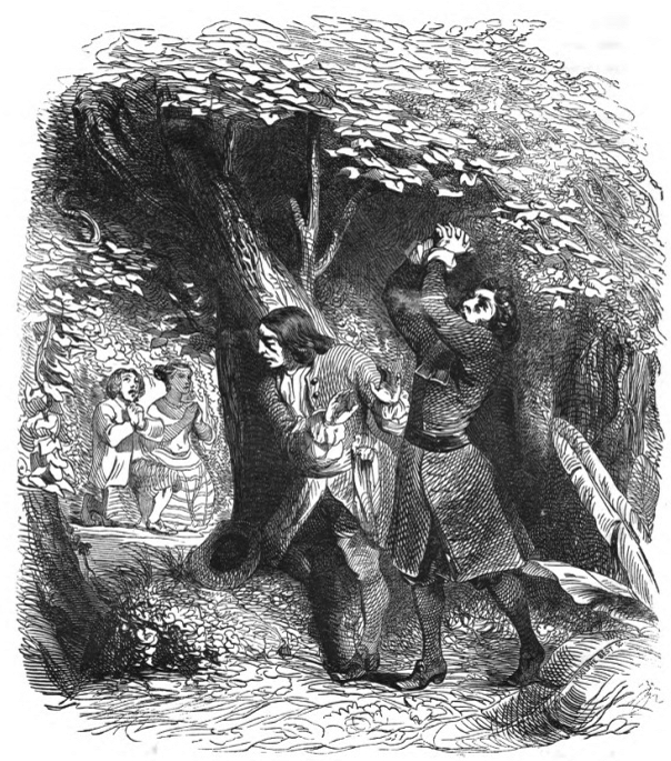 De twee Engelschen dachten, dat zij schertsten, en noodigden hen binnen te komen, om te zien welk slag van huizen zij gebouwd hadden, en hun te zeggen hoeveel grondrente zij daar wel voor moesten betalen. Een hunner voegde er lagchende bij, dat hij hoopte, zij zouden, als grondeigenaars, het land verbeteren en er gebouwen opzetten, en hun, volgens gewoonte, een langen pachttijd vergunnen, en verzocht hun een notaris te halen om de grondbrieven op te maken. Een der anderen zeide daarop onder veel vloeken en zweren, dat zij zien zouden, dat het geene gekheid was, en een eind weegs vandaar gaande, waar de ander een vuur aangelegd had, om eten te koken, nam hij een brandend stuk hout en wierp het tegen de hut, die binnen weinige minuten in de asch zou gelegd zijn, zoo niet de ander hem weggestooten, en hoewel niet zonder moeite, het vuur had uitgetrapt.