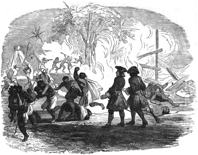 Hierin zouden de Spanjaards genoegen hebben genomen, als de anderen hen slechts ongemoeid hadden gelaten, maar dit konden zij niet van zich verkrijgen, en even als de hond in de fabel wilden zij noch zelf eten, noch het anderen laten doen. Wel waren hunne geschillen in het eerst beuzelachtig en niet meldenswaard, maar eindelijk barstten zij in openbaren oorlog uit, en deze begon met alle denkelijke woestheid en ruwheid, zonder oogmerk, zonder aanleiding, en inderdaad strijdig met alle gezond verstand, en ofschoon het eerste verhaal er van mij door de Spanjaarden, als het ware de aanklagers, gedaan werd, konden de kerels, toen ik hen daarover ondervroeg, er geen woord van ontkennen.