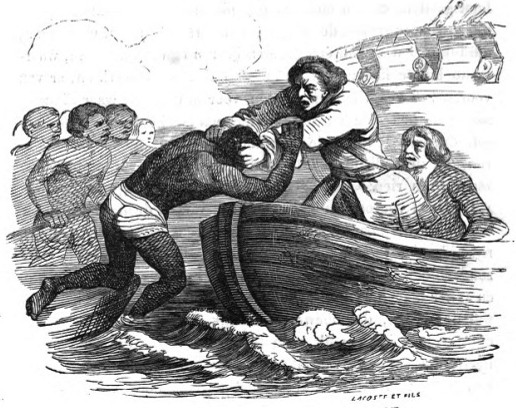 Er bevonden zich twee priesters onder hen, een oud en een jong man, en wat zonderling was, de oude man was het hevigst aangedaan. Zoodra hij aan boord van ons schip was, en zich gered zag, viel hij als dood neder, terwijl er geen teeken van leven in hem te bespeuren was. Onze doctor diende hem dadelijk de noodige middelen toe, en was de eenigste man aan boord, die niet geloofde, dat hij dood was, en eindelijk deed hij hem eene aderlating, na zijn arm eerst gewreven te hebben, om dien te verwarmen. Eerst kwam het bloed bij droppels, en vloeide toen wat ruimer; drie minuten later sloeg de man de oogen op, en een kwartier daarna scheen hij volkomen hersteld. Nadat zijn arm verbonden was, liep hij heen en weêr, zeide, dat hij geheel hersteld was, en nam een drankje in, dat de doctor hem gaf. Een kwartier uurs later kwam men den doctor roepen, die eene in flaauwte liggende Fransche vrouw aderliet, en zeide, dat de priester ijlhoofdig was geworden, gelijk ook werkelijk het geval was. De doctor wilde hem in dien toestand niet aderlaten, maar gaf hem een verdoovend en slaapwekkend middel in, dat na eenigen tijd werkte, en den volgenden morgen ontwaakte de oude man volkomen wel en bij zijn volle verstand.