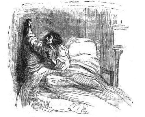 De knaap, die ten koste van zijn moeders leven bewaard was gebleven, was nog niet zoo ver heen, maar toch lag hij in eene kooi uitgestrekt, en gaf naauwelijks eenig teeken van leven. Hij had een stuk van een ouden handschoen in zijn mond, waarvan hij het overige opgegeten had. Daar hij echter jong en sterker was dan zijne moeder, gaf de stuurman hem langzamerhand wat in, en hij begon zigtbaar te herleven, schoon hij, toen hij eene poos daarna twee of drie lepels te gelijk innam, zeer ongesteld werd en het niet kon binnenhouden.
