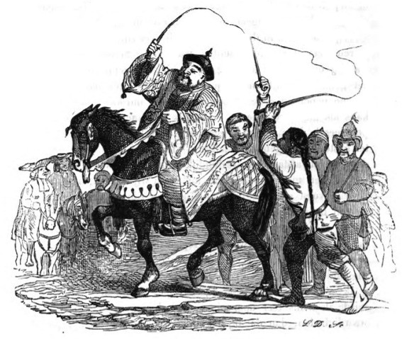 Ik ging te voet mede met mijnen ouden loods en een Chinees, daar ik zeer naar eenige verscheidenheid verlangde. Aan de plaats komende, zagen wij, dat dit eene lage, moerassige plek was, door eenen muur van los opgestapelde steenen omringd, met eene kleine wacht van Chinesche soldaten aan den ingang. Na een kameel uitgezocht en den koop gesloten te hebben, ging ik heen, en de Chinees, die bij mij was, leidde de kameel, toen plotseling vijf Tartaren kwamen aanrijden; twee hunner grepen den man en ontrukten hem den kameel, terwijl de drie anderen naar mij en mijnen ouden loods toetraden, ziende dat wij genoegzaam ongewapend waren, want ik had niets bij mij dan mijne sabel, waarmede ik mij kwalijk tegen drie ruiters verdedigen kon. De eerste bleef staan, toen hij mij mijne sabel zag trekken (want het zijn groote lafaards), maar een tweede kwam mij op zijde en gaf mij eenen slag op het hoofd, dien ik eerst naderhand voelde, want toen ik weder bijkwam, wist ik niet hoe ik het had noch waar ik was, want ik was op den grond gevallen, maar mijn brave oude loods had door eene bestiering der Voorzienigheid eene pistool in zijnen zak, waarvan ik noch de Tartaren iets wisten, anders zouden zij ons zeker niet aangevallen hebben. Maar lafaards zijn altijd het moedigst als er geen gevaar is.