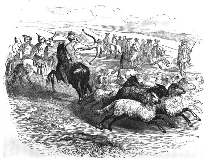 Vroeg in den morgen, toen wij Van een klein, welgelegen dorp, Changu geheeten, opbraken, moesten wij eene rivier overtrekken, waar wij moesten overvaren, en zoo de Tartaren op kondschap uitgegaan waren, hadden zij ons hier moeten overvallen, toen de karavaan overgetrokken en de achterhoede nog aan de andere zijde was, maar zij lieten zich daar niet zien. Eerst drie uren later, toen wij op eene woeste vlakte van ongeveer vijftien of zestien mijlen gekomen waren, zagen wij aan eene opstijgende stofwolk, dat de vijand nabij was, en dit was ook zoo, want zij kwamen naar ons toerijden.