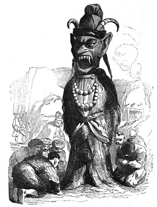 Eenige blijken hiervan vonden wij in het land tusschen Angura, waar wij het Russische gebied betraden, en eene door de Russen en Tartaren bezeten wordende stad, Nortzinskoi genaamd, welke tusschenruimte uit eene aanhoudende woestijn bestond, die ons twintig dagen kostte, om door te trekken. In een dorp nabij de laatste plaats, dreef de nieuwsgierigheid mij, om hunne leefwijze te bezien, die alleronbeschaafdst is. Zij hadden dien dag eene groote offerande, denk ik, want op een ouden boomstronk stond een houten afgod, zoo leelijk als de duivel, althans zoo leelijk als iets wat den duivel voorstellen moet, wezen kan; zijn hoofd geleek naar niets wat ooit iemand zag, zijne ooren waren zoo groot en dik, als bokkenhorens, zijne oogen zoo groot als een driegulden, een neus als een gekromde ramshoorn, en een muil met vier hoeken als die van eenen leeuw, met leelijke tanden, zoo hoekig als de sneb van een papegaai. Hij was zoo leelijk gekleed als men denken kan, zijn bovenkleed was van schapenhuiden met de wol buitenwaarts, en hij had eene groote Tartaarsche muts op het hoofd met twee hoorns er doorkomende. Het was ongeveer acht voet hoog, maar had geene beenen, noch eenige andere ligchaamsdeelen.