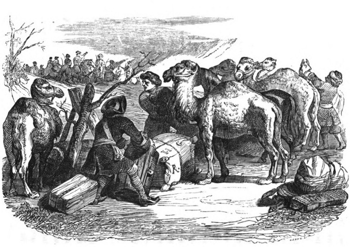 In het doortrekken van deze woestijn, nadat wij alle gevaren zoo wij meenden, reeds achter den rug hadden, dacht ik dat wij nog uitgeplunderd en misschien vermoord zouden worden door eene troep roovers. Ik weet nog niet uit welk land zij waren; hetzij het zwerfbenden waren van de Ostiaken, eene soort van Tartaren, of woest volk van de boorden van de Oby, die tot hier heen gezworven waren, dan wel of het Siberische sabeljagers waren; maar zij waren allen te paard, droegen boog en pijlen, en waren eerst vijfenveertig in getal; zij kwamen tot op ongeveer twee geweerschoten afstands van ons, en zonder ons eenige vragen te doen, reden zij om ons heen en sloegen ons zeer ernstig gade. Eindelijk plaatsten zij zich vlak voor ons, waarop wij ons in een gelid voor onze kameelen schaarden, daar wij nog geen zestien man in het geheel uitmaakten, en zonden den Siberischen knecht naar hen toe om te zien wie zij waren. Zijn meester was te meer geneigd hem te laten gaan, daar hij zeer beducht was dat het een Siberische troep was, die men hem achterna had gezonden. De man reed naar hen toe met eene witte vlag en sprak hen aan; maar schoon hij verscheidene van hunne talen of liever tongvallen gebruikte, kon hij geen woord verstaan van hetgeen zij zeiden. Na eenige teekens die zij hem deden van niet nader te komen als hij zijn leven lief had, en een aanbod om hem dood te schieten als hij naderde, ten minste zoo verstond hij hunne bedoeling, kwam de man terug, even wijs als toen hij ging; echter zeide hij dat hij hen, naar hunne kleeding, voor Tartaren of Kalmukken, of voor eene horde Circassiërs hield, en dat er in de groote woestijn meer van hen moesten zijn, schoon hij nimmer gehoord had, dat er vroeger ooit eenige zoo ver noordwaarts waren doorgedrongen.