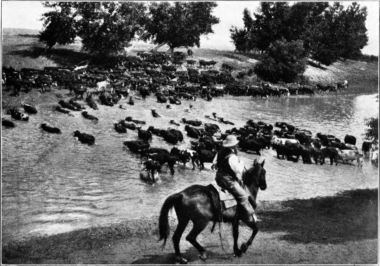 Four days later the herd was bedded down in the valley of the Pecos River, a mile or two back from the stream. About noon the next day, when the cattle were thirsty, the whole herd was drifted down to the river at a place picked out by the wagon boss where the banks were broken down so the cattle could reach the water. On the opposite side the bank was low, making a good "coming out" place.