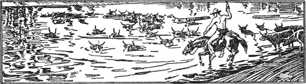 The others followed, calves bawling, men shouting, the animals plunging and tearing through the swift waters. Soon the leaders were swimming and, as the water deepened, the old blue touched her baby on the nose and told him something in cow language which made him immediately get on the upstream side of her and stay there as they swam across the river. The swift water forced the little fellow against her side, where he hung like a leech, while his mother swam, strong and steadily, for the opposite bank. If the leaders had any desire to turn downstream they met a horseman on that side, swinging his slicker, and shouting with all his might, and keeping just far enough back of the leaders to stop them from turning downstream, and still not check them in their swimming toward the other side.