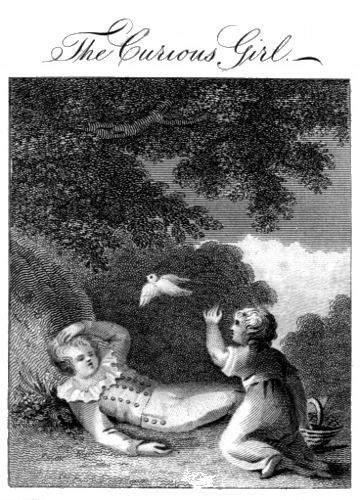 "You see, my dear Arabella, the consequence of your curious and suspicious temper: I wished to make you a present to-day, because it is your birthday, but you will not allow your friends to procure you an agreeable surprise; for nobody in the house can take a single step, or do the least thing, without your watching and following them. I know you have long wished to have a white pigeon, and I have walked two long miles in all this heat, to get one for you. I sat down here, that I might have time to contrive how I should get it into the house without your seeing it, because I did not wish to give you my present till after dinner, when papa and mamma will give you theirs; and whilst I was endeavouring to think on some way to escape your prying eyes, I was so over-powered with fatigue and heat, that I fell fast asleep; and I see you have taken that time to peep into my basket, and save me any farther trouble. You have let my present fly away: I am sorry for it, my dear sister, but you have no one to blame but yourself; and I must confess that I am not half so sorry for your loss, as I am for the fate which attends two poor little young ones which are left in the basket, and who, far from being able to take wing, and follow their mother, are not old enough even to feed themselves, and must soon perish for want of food."