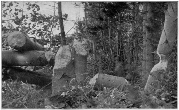 Early one October an early snowfall worked[Pg 201] hardship in several colonies near my home. Fortunately the ponds were not deeply frozen, and those colonies which had aspen groves close to the water succeeded in felling and dragging in sufficient food-supplies for the winter. As snow drifted into the groves, many of the trees harvested were cut from the tops of snowdrifts, and thus left high stumps. The following summer a number of these stood four feet above the earth and presented a striking appearance alongside the sixteen-inch stumps of normal height.