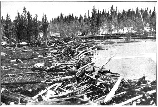 The dam-material used in obstructing the ditch consisted chiefly of the peeled sticks from which the beaver had eaten the bark in winter; along with these were mud and grass. The fourth time that the ditch guard returned, he threw away all the material in the dam and then set some steel traps in the water by the mouth of the ditch. The first two beaver who came to reblockade the ditch were caught in these traps and drowned while struggling to free themselves. Other beaver heroically continued the work that these had begun. The cutting down of saplings [Pg 181]and the procuring of new material made their work slow, very slow, in the face of the swiftly escaping water; when the ditch was at last obstructed, a part of the material which formed this new dam consisted of the traps and the dead bodies of the two beaver who had bravely perished while trying to save the colony.