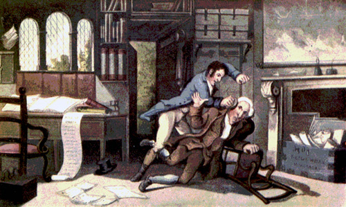 | Sir David Dangle, whom the gout Had kept that night from going out, Was sitting in all sick-man's quiet, Nor dreaming of a scene of riot When, waken'd into wild amaze, He did on the strange vision gaze, While the bold reprobate intrusion Threw all the house into confusion. In rush'd domestics one and all, Who heard the bell's alarming call; While stamping crutch and roaring voice Encreas'd the Knight's awak'ning noise That he might quick assistance stir Against this unknown visiter. But while the household struggled hard To keep him still, and be his guard, Till he thought fit to lay before 'em The cause of all his indecorum; 222 My Lady came to set all right And check the hurry of the night: She then, to soothe his rude alarms Clasp'd her dear Knight within her arms, Those arms which, for full forty years, As from tradition it appears, Had sometimes strok'd his chin and coax'd him, And now and then had soundly box'd him. "It is," she said, "some heated rake, Who has occasion'd the mistake. But loose your hands, I do protest, To be thus us'd, he's too well drest |