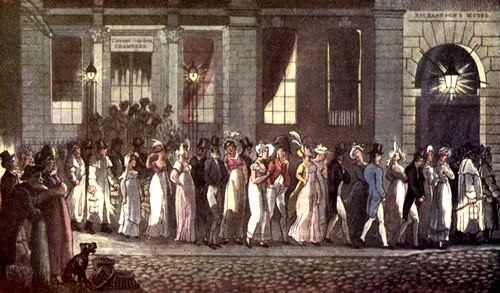 | —Ye Dandies, Bucks or by what name Bond Street re-echoes with your fame; Whether in Dennet, Gig or Tandem, In five-cap'd coats you bang at random, With such nice skill that you may break Your own, or Dulcinea's neck: Or, when lock'd arm in arm you meet, From the plain causeway to the street, Drive Ladies in their morning walk, While you enjoy your lounging talk: Then saunter off to pass your hours In roving through those gaudy bowers Where purchas'd pleasure seems design'd To occupy the thoughtless mind: |