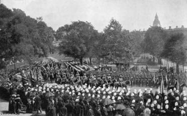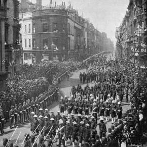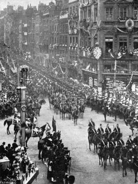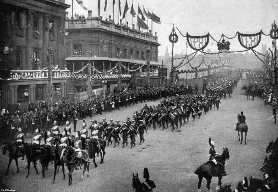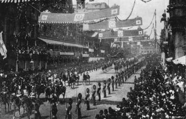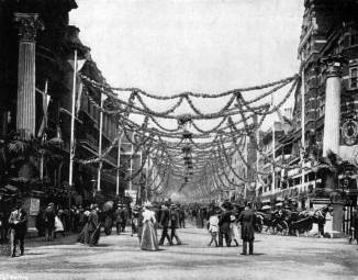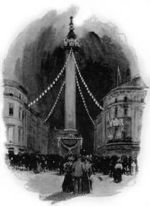 Illuminations in London—Festivities in the Provinces and the Colonies—Addresses of Congratulation from the Lords and Commons—Gathering of School Children on Constitution Hill—State Performance at the Opera—The Princess of Wales’s Dinners to the Poor—State Reception—Special Performance at the Lyceum—Torchlight Evolutions by Etonians at Windsor—Naval Review at Spithead—The Fleet Illuminated—The Colonial Troops at the Naval Review.